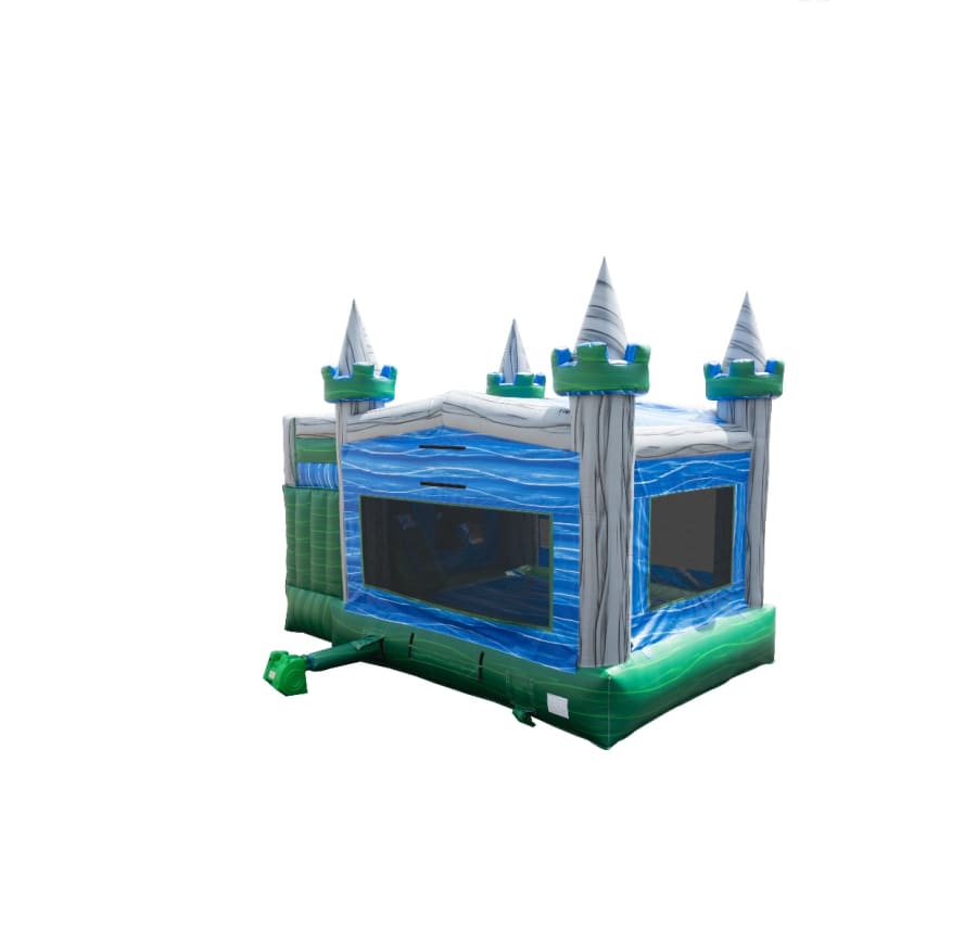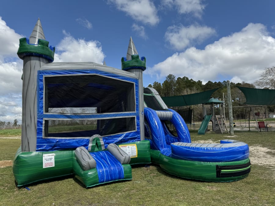 ๐๐ปIncludes a bounce house, a climbing wall, a slide and a basketball hoop.