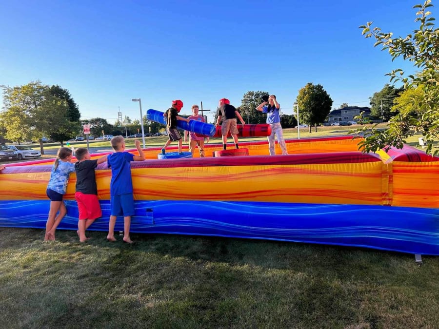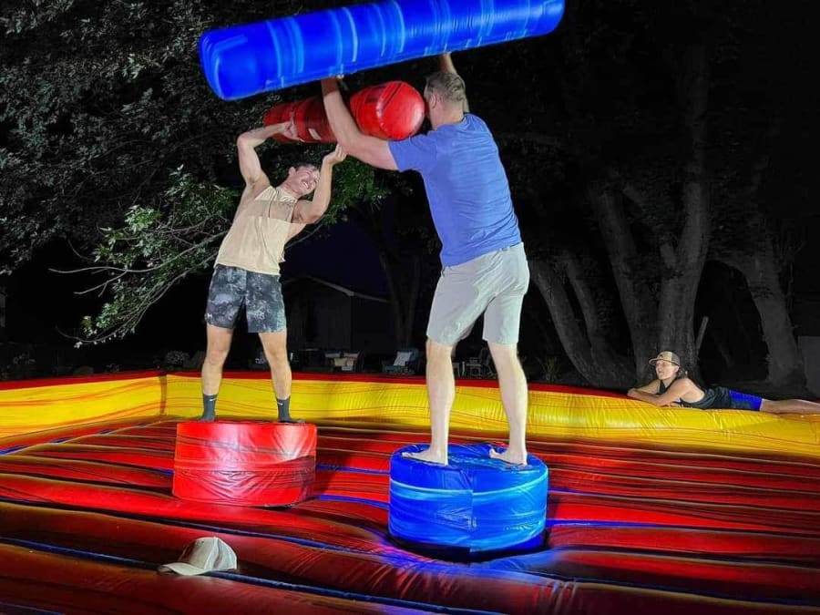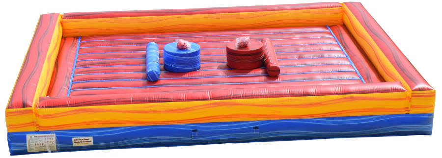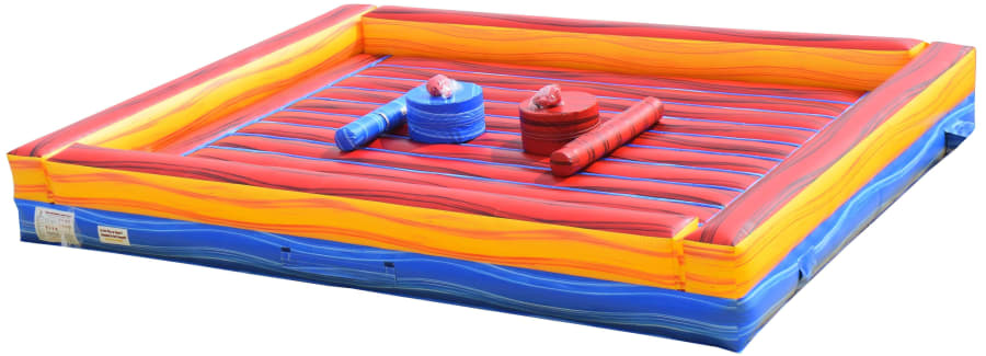 The Pedestal Joust is 25’ x 20’ and has safety walls. Includes 2 foam pedestals, 1 pair of joust poles and headgear.