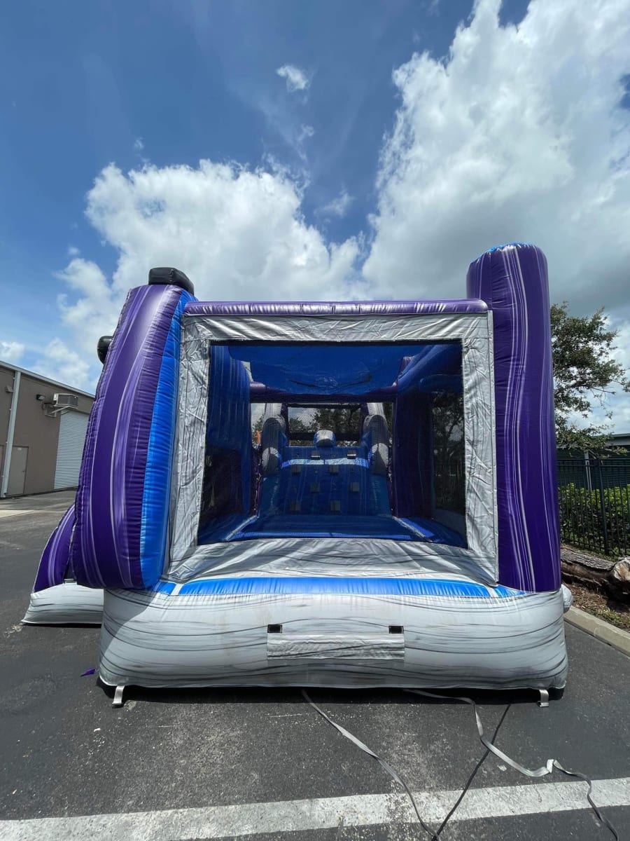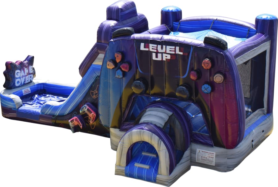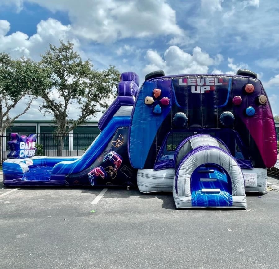 👉🏻Includes a bounce house, a climbing wall, a slide and a basketball hoop.