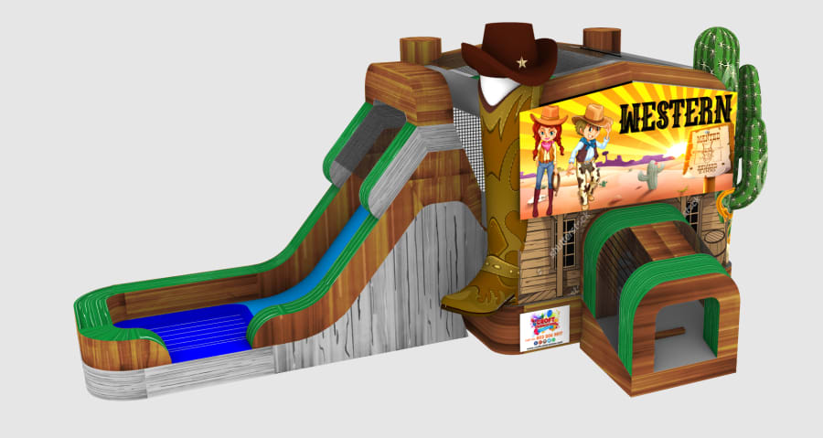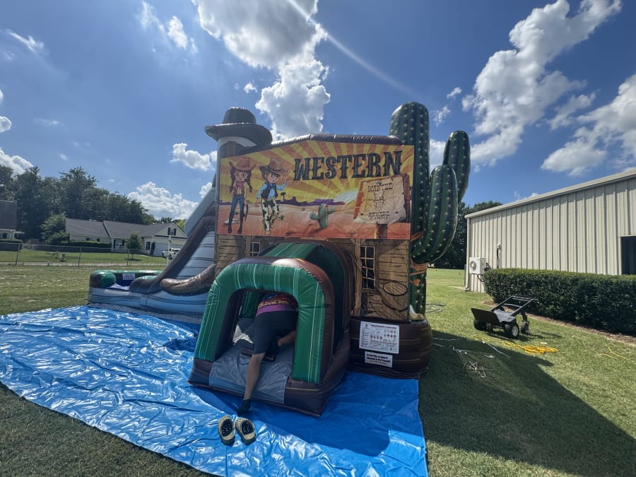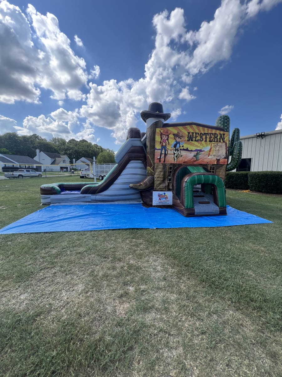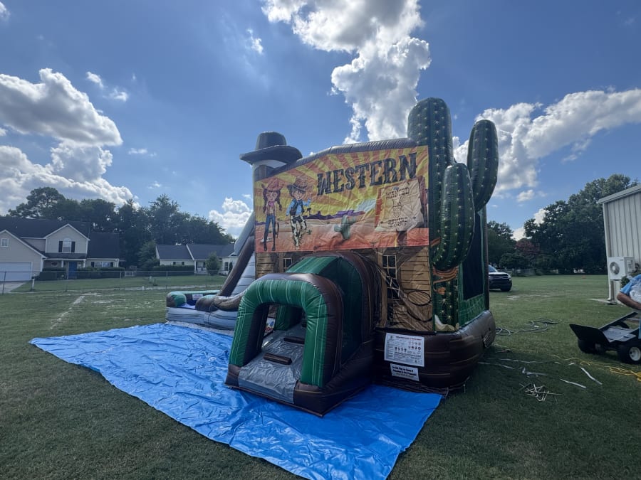 ๐๐ปIncludes a bounce house, a climbing wall, a slide and a basketball hoop.